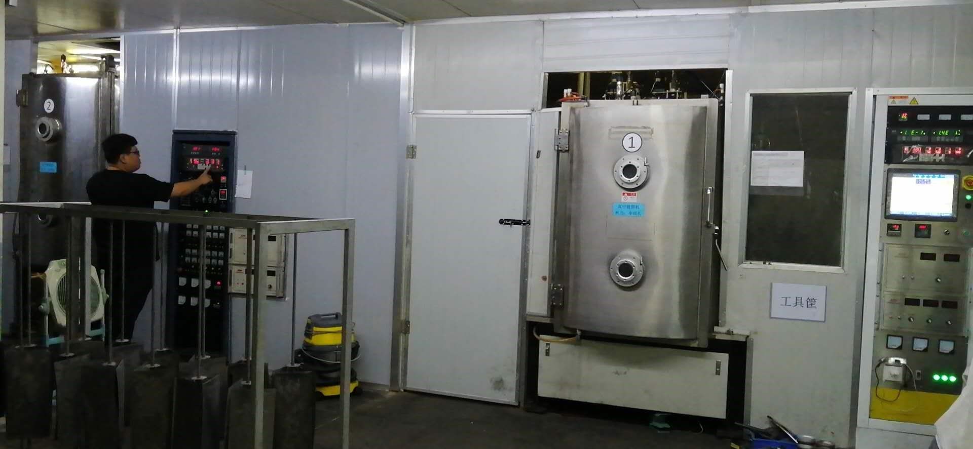 我們又去參觀了真空鍍車間,原來(lái)真空鍍一般跟蝕刻是相連的,也就是說(shuō)很多不銹鋼產(chǎn)品要先蝕刻出形狀來(lái),再根據(jù)客戶的要求鍍上顏色,顏色一般分金色,玫瑰金,槍聲,黑色,灰色等等。青島大東電子有兩臺(tái)真空鍍?cè)O(shè)備,老板說(shuō)是從韓國(guó)買的,特別貴,我很是羨慕。