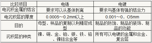 電鑄與電鍍的最大不同是,電鍍的產(chǎn)品是被鍍件和產(chǎn)品的復(fù)合體,而電鑄則只是以電沉積層為所需要的制品,最終要將鍍層與母型脫離。電鑄與電鍍的區(qū)別如下表: